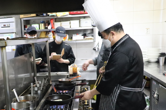 | ↑↑ 장상준 계명문화대학교 교수(식품영양조리학부·오른쪽)가 지역 정통 레스토랑 '아담스키친' 조리종사원을 대상으로 재직자 교육을 진행하고 있다. 계명문화대 제공 |