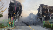 이랜드 물류창고 화재 이틀 째인 16일 충남 천안 동남구 이랜드패션 물류센터 창고 정문 출입구가 완전히 붕괴돼 기둥부를 남기고 붕괴돼 있다. 소방당국은 대응 1단계를 유지한 채
