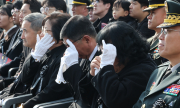 23일 대전 유성구 국립대전현충원에서 열린 제15주년 연평도 포격전 전투영웅 추모 및 전승기념 행사에서 유족들이 눈물을 닦고 있다.