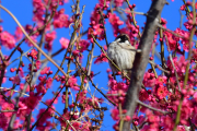 23일 오전 포항 남구 연일읍 도로변에서 참새 한마리가 홍매화 나무에 앉아 쉬고 있다.