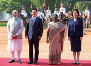 이재명 대통령과 김혜경 여사가 20일 뉴델리 대통령궁 광장에서 열린 공식 환영식에서 드라우파디 무르무 인도 대통령, 나렌드라 모디 인도 총리(왼쪽)와 기념촬영 하고 있다.