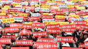 21일 오후 서울 영등포구 여의대로 일대에서 열린 농협 자율성 수호 농민 결의대회에서 조합원들이 구호를 외치고 있다