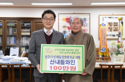 산내들와인 대표 김기진씨가 장욱현 영주시장에게 장학금 100만원을 기탁하고 있다, 영주시 제공 영주시인재육성장학회는 산내들와인(대표 김기진), 우리향토음식연구회(대표