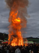 청도군이 정월대보름을 맞아 청도천 둔치에서 열린 달집태우기 행사에서 거대한 달집에 불이 붙으며 붉은 화염이 밤하늘을 수놓고 있다. 정월대보름은 한 해 첫 보름달이 떠오르는 날로,