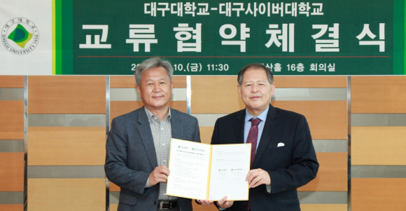 | ↑↑ 김상호 대구대 총장(왼쪽)이 대구사이버대 이근용 총장(오른쪽)과 경산캠퍼스 성산홀(본관) 16층 회의실에서 온라인 강의 확대와 질적 향상을 위해 상호교류 협약 체결 후 사진촬영을 하고 있다. 대구대 제공 |
