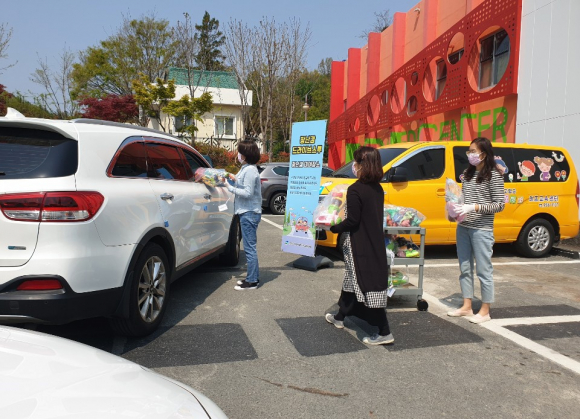 | ↑↑ 계명문화대학교에서 위탁운영하고 있는 고령키즈교육센터에서 장난감 대여 서비스를 드라이브 스루로 진행하고 있다. 계명문화대학교 제공 |