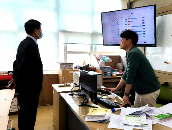 | ↑↑ 김영윤 교육장이 원격수업 유형별 학급별 수업 상황과 플랫폼의 안정성 및 접속 유지 시간 등을 살펴보고 있다. 경산교육청 제공 |