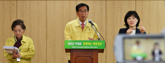 ↑↑ 최영조 경산시장(가운데)이 최근 코로나19에 대응하는 긴급 생활비 지원 브리핑을 하고 있다,