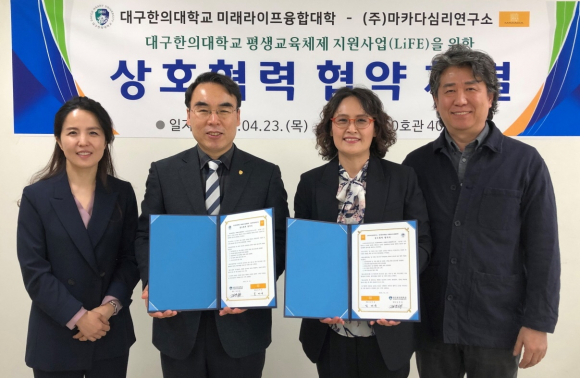 대구한의대학교 미래라이프융합대학은 최근 예체능관 세미나실에서 코로나19로 인한 성인학습자들의 온라인 상담 지원을 위해 ㈜마카다심리연구소와 협약을 체결했다고 27일 밝혔다.