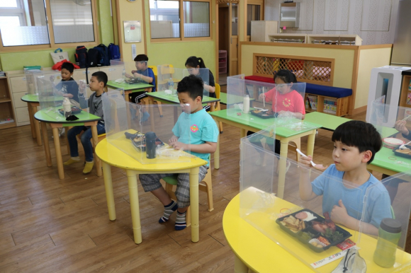 이때 학생들의 안전을 위해 이동식 투명칸막이를 사용해 학습할 때나 점심 및 놀이 활동 시간에 이용하고 있다.