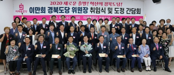 | ↑↑ 미래통합당 경북도당 신임 이만희 위원장(앞줄 가운데)이 이승율 청도군수(앞줄 오른쪽 세번째)와 경북도당 5층 강당에서 영천과 청도의 지역구 주민들과 시·도의원 등이 ‘경북도당위원장 이·취임식 및 도정간담회’을 열고 단체 사진촬영을 하며 파이팅을 외치고 있다. |