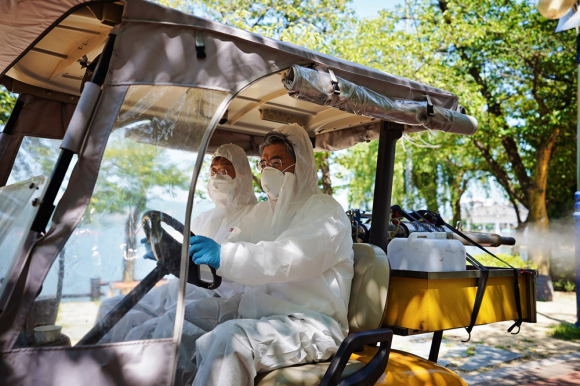 | ↑↑ 김성조(오른쪽) 공사 사장이 보문관광단지에서 직접 코로나19 방역을 하고 있다. <경북문화관광공사 제공> |