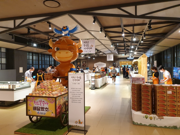 | ↑↑ 신계계백화점 부산 센텀시티점에서 청도 우수농특산물 상생장터가 열리고 있다. 청도군 제공 |