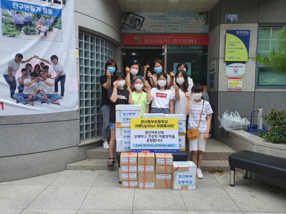 | 경산동부초등학교는 지난 달 31일 교육복지 사랑Up!Go!자원봉사단 학생 16명이 어르신들을 위해 직접 만든 천연 모기퇴치제, 물먹는 꿀꿀이 등 총 4가지 물품을 경산시재가노인지원센터에 전달했다. 경산동부초등학교 사랑Up!Go!자원봉사단은 배려와 나눔을 배우고 실천하기 위해 2017년에 경산시백천사회복지관과 업무협약을 체결하고 창단했으며 요양원과 어르신복지센터 등을 방문해 우쿨렐레 연주와 트로트 댄스 공연, 생신 축하 활동 등으로 어르신들과 함께하는 재능기부 자원봉사활동을 실시했다. 경산시재가노인지원센터의 노인맞춤돌봄서비스 담당 사회복지사는 “학생들이 어르신들을 위해 직접 만들어 보내준 예쁜 꽃모양 부채 등을 학생들의 따뜻한 마음과 함께 어르신들께 잘 전달해 유용하게 사용하도록 하겠다”고 전했다. 황보문옥 기자 |