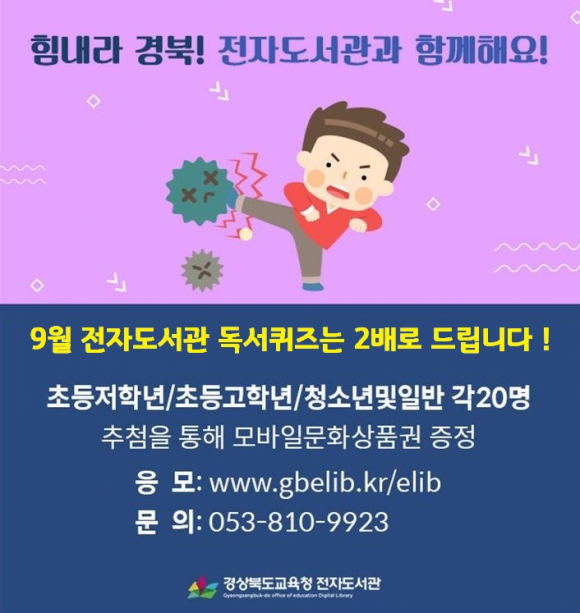 코로나19 확산으로 사회적 거리두기 2단계로 격상돼 경북지역 도서관이 재휴관을 했지만, 경북도민이라면 경북도교육청 전자도서관(www.gbelib.kr/elib)을 통해 독서 생활을 즐길 수 있다. 경북도교육청 전자도서관은 전자책 2만5천000여종, 오디오북 3천여종 등을 보유하고 있으며, 경북도교육청 소속 도서관 정회원이면 누구나 이용할 수 있다. 이용자를 위한 이벤트로 매월 독서퀴즈를 운영하며 초등저학년·고학년, 청소년 및 일반을 대상으로 추첨을 통해 모바일문화상품권을 증정하고 있다. 특히 9월은 휴관으로 인해 도서관을 방문하지 못하는 도민들에게 더 가까이 다가가고자 독서퀴즈 당첨인원을 두 배(30명▶60명)로 늘려서 실시하며, 응모는 전자도서관 홈페이지에서 오는 10일부터 25일까지 할 수 있다. 또한, 9월 독서의 달을 맞아 1일부터 경북도교육청 전자도서관에서 전자책을 읽고 해당 책 페이지의 서평 코너에 ‘한 줄 서평’ 을 남기면 30명을 추첨해 모바일문화상품권을 증정할 예정이다. 손경림 정보센터 관장은 “경북도교육청 전자도서관과 다양한 이벤트가 코로나19 확산으로 힘든 시간을 보내고 있는 지역민들에게 따뜻한 위로가 될 수 있는 계기가 됐으면 좋겠다"며, "앞으로도 더욱 지역민에게 다가갈 수 있는 도서관이 되겠다”고 말했다.