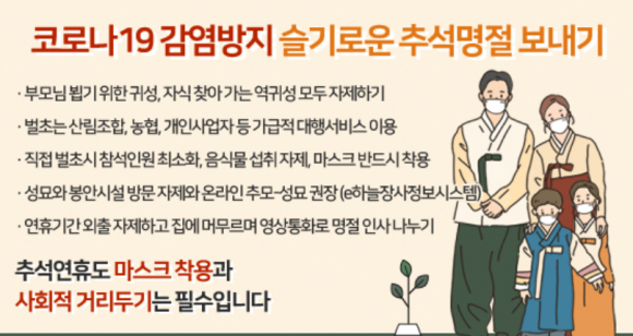 군에 따르면 추석명절을 건강하고 안전하게 보내기 위해 △부모님 뵙기 위한 귀성, 자식 찾아 가는 역귀성 모두 자제하기 △벌초는 산림조합, 농협, 개인사업자 등 대행서비스 이용하기 △직접 벌초 시 참석인원 최소화, 음식물 섭취 자제, 마스크 착용 필수 △성묘와 봉안시설 방문 자제와 e하늘 장사정보시스템을 활용한 온라인 추모와 성묘 권장 △연휴기간 외출 자제하고 집에 머무르며 전화통화로 명절 인사 나누기 등 세부 방역 수칙을 제시해 군민과 출향인 모두가 동참할 수 있도록 홍보한다.