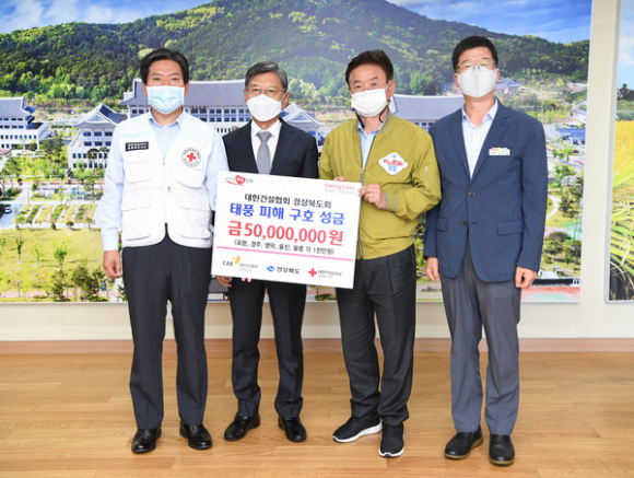 | 대한건설협회 경북도회가 28일 도청에서 태풍(마이삭, 하이선)으로 어려움을 겪고 있는 피해지역 도민들을 지원하기 위해 성금 5천만원을 대한적십자사경북지사에 기탁하는 행사를 가졌다.
