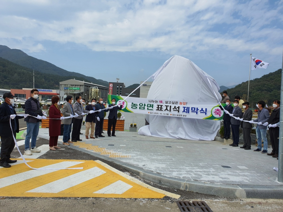 | “농암면 표지석”제막식을 개최하고있다(문경시제공) | 문경시 농암면행정복지센터는 지난 12일 오전 11시 청사 앞 광장에서 도의원, 파출소장, 관내 기관 단체장과 지역주민 등이 참석한 가운데 '농암면 표지석' 제막식을 열었다. 표지석은 농암면 한우물길 지역주민의 기증을 받았고 운반과 설치는 기관단체의 도움을 통해 높이 5m, 폭 3.5m의 화강암을 설치했다. 또한 '백두대간의 중심 농암면'이라는 글은 조영진 선생으로부터 기증받아 각자했다. 제막식 참석자들은 “농암면의 정체성을 확립하고 자긍심을 고취해 주민화합과 지역발전에 기여할 것으로 기대한다”고 기뻐했다. 오재영기자 |