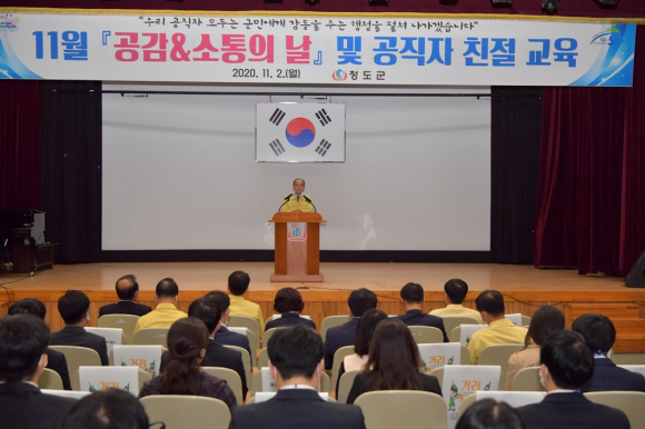 | ↑↑ 청도군이 지난 2일 군민회관에서 군청, 읍면 직원을 대상으로 친절에너지 충전을 위한 '공직자 친절교육'을 실시하고 있다. 청도군 제공 |