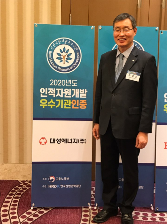 | 우중본 대성에너지 대표이사.<대성에너지 제공> | 대성에너지(주)는 지난 6일 2020년 인적자원개발 우수기관(Best HRD) 인증 수여식에 참여해 ‘민간 대기업’ 부문 우수기관 인증을 받았다고 밝혔다. 이번 고용노동부와 산업통상자원부, 중소벤처기업부, 교육부가 공동 주최한 Best HRD 인증 사업은 능력 중심의 인재 채용과 재직 중인 근로자에게 지속적으로 교육 기회를 제공하는 우수 기관과 기업을 발굴해 인증하는 제도로 지난 9월에 2020년도 인증 기관이 발표 됐으나 코로나19 영향으로 수여식이 연기돼 이 날 시행됐다. 대성에너지는 체계적인 인적자원관리와 계층별 인재육성 프로그램의 운영, ‘허심탄회’와 같은 대표이사와 직원간 정기적인 소통 프로그램 활성화 등 차별화된 인적자원개발 시스템 운영에 높은 평가를 받았다. 우중본 대성에너지 대표이사는 "이번 민간 대기업 부문 인증은 대구지역에서 최초 인증으로 의미가 깊다“며 ”특히 앞으로도 인적자원 관리와 개발에 힘써 더욱 성장하고 발전하는 회사를 만들겠다"고 말했다. 윤기영 기자 |