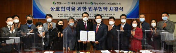 경산시가 대구한의대학교 및 경산시지역사회보장협의체와 지난 20일 대구한의대에서 '지역사회 주민맞춤형 복지마을 만들기' 업무협약을 체결했다고 밝혔다.