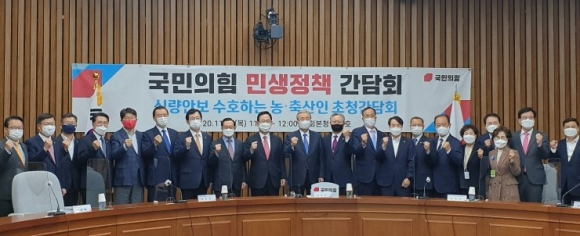 | ↑↑ 김종인 비상대책위원장, 주호영 원내대표, 이종배 정책위의장, 이만희 의원 등 직능단체 대표들이 국회 본관에서 열린 국민의힘 민생정책 간담회 '식량안보 수호하는 농·축산인 초청간담회'를 갖고 단체 기념촬영을 하고 있다. |