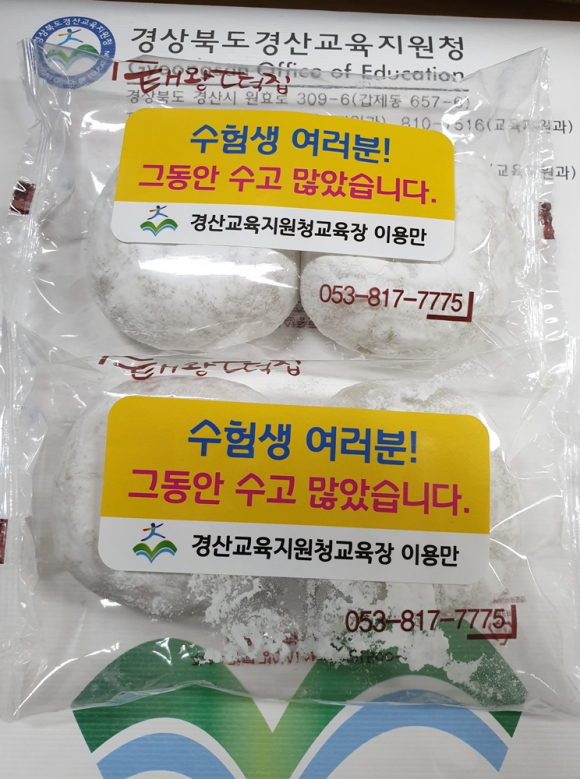 한편, 경산교육장은 지난 18일 경산고, 경산여고, 문명고, 사동고를, 23일에는 진량고, 무학고, 영남삼육고, 하양여고를 방문해 수험생과 교원들의 노고에 대해 위로할 예정이었으나, 코로나19 감염을 우려해 학교 방문을 취소하고, 찰쌉떡과 서신으로 따뜻한 격려의 마음을 전달하는 것으로 대신한다.