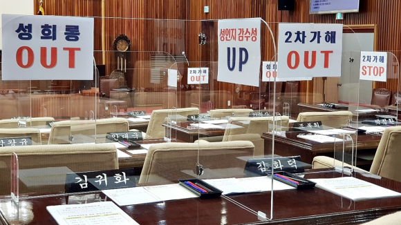 ↑↑ 대구 달서구의회 본회의장에 성희롱 관련 의혹 구의원들에 대한 '솜방망이 처벌'을 규탄하는 팻말이 붙여져 있다.<뉴시스 제공>
