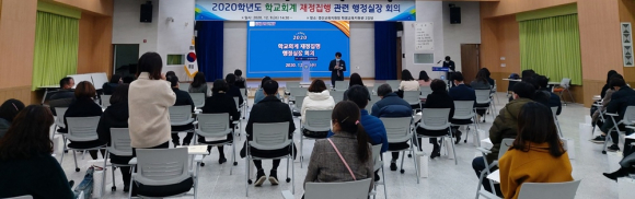 | ↑↑ 경산교육지원청이 관내 유·초·중학교 행정실장 등이 2020학년도 학교회계 재정집행 향상을 위한 회의가 열리고 있다. 경산교육청 제공 |