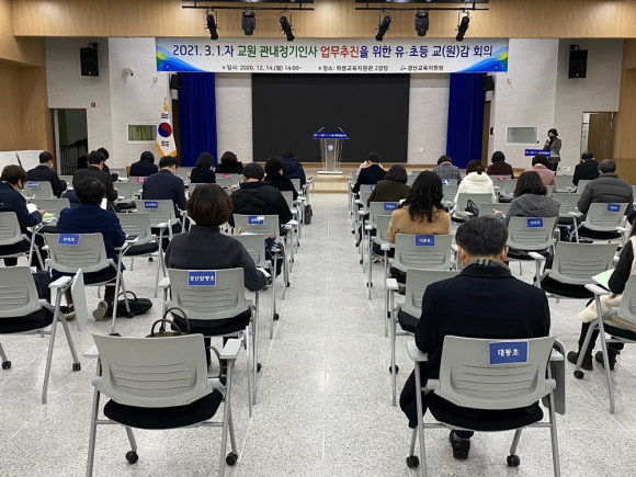 | ↑↑ 경산교육지원청이 14일 2021년 3월 1일자 유·초등 교원 정기인사를 위한 교(원)감 회의를 하고 있다. 경산교육지원청 제공 |