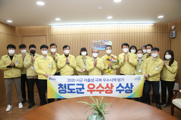 | ↑↑ 청도군이 2020년 경북도에서 실시한 시·군 저출생 극복 우수시책 평가에서 ‘우수상’을 수상해 기념사진을 찍고 있다. 청도군 제공 |