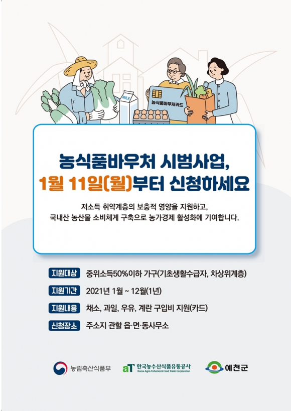 예천군은 농림축산식품부에서 추진하는 ‘2021년 농식품바우처 시범사업’ 공모에 도에서 유일하게 선정돼 국비 6억 7,500만 원을 확보했다. 농식품바우처 시범사업은 중위소득 50% 이하 기초생활수급자, 차상위 계층을 대상으로 가구원수 기준 1인 가구 월 4만 원, 2인 가구 5만 7000원, 3인 가구 6만 9000원 등 채소와 과일 등 농식품을 구입할 수 있는 전자카드 형태 바우처를 12개월간 지원한다. 이번 사업 선정으로 2,650여 가구가 혜택을 받을 수 있게 됐으며 저소득 취약계층들에게 신선하고 품질 좋은 식재료를 공급해 영양 개선과 농식품 소비로 코로나19로 위축된 지역 경제 활성화에도 기여할 것으로 기대 된다. 사업 대상자는 내년 1월 11일부터 주소지 읍·면행정복지센터를 방문해 신청하면 되고 발급받은 바우처 카드로 지역내 농·축협 하나로마트, 로컬푸드 직매장에서 신선채소, 과일, 우유, 달걀 등 식재료를 구입하면 된다. 예천군은 원활한 사업 추진을 위해 현수막 설치와 리플렛을 제작해 배부했으며, 공무원들의 사업 이해도를 높이고 업무 능력을 향상시킬 수 있도록 29일 사업 전반에 대해 읍·면담당자 교육을 할 계획이다. 아울러, 대중교통 소외지역에 거주하는 교통약자와 거동이 불편한 고령자 등 편의 제공을 위해 각 가정으로 직접 꾸러미를 배송할 수 있도록 관련자 협의를 추진하며 사업 준비에 박차를 가하고 있다. 김학동 군수는 “경북도에서 유일하게 선정된 이번 바우처 시범사업으로 저소득 취약계층 먹거리 복지 증진과 지역 농산물 소비 촉진 활성화가 되고, 예천에서 생산되는 우수하고 신선한 농·특산물을 공급해 소비·유통 활성화로 연계시켜 지역 경제 활성화가 될 수 있도록 노력하겠다”고 했다.