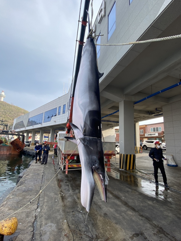 | 밍크고래인양장면(울진해경제공) | 울진해양경찰서(서장 조석태)는 지난 29일 오후 영덕군 경정3리항 앞바다에서 밍크고래 1마리가 죽은 채 발견됐다고 밝혔다. 울진해경에 따르면 지난 29일 오후 1시 40분경 영덕읍 경정3리항 남동방 약 3.6해리(약 6.7 km) 해상에서 연안통발어선 A호(5.86톤) 선장 B(62세)씨가 약 일주일 전 투망해 둔 통발을 양승하던 중, 통발 원줄에 머리 부분이 감겨 죽어있는 밍크고래 1마리를 발견해 축산파출소에 신고했다. 신고를 받고 출동한 울진해경은 밍크고래의 표피 및 외형상 작살 등을 이용한 불법포획여부를 정밀하게 조사한 결과 불법포획 혐의점이 발견되지 않아 A호 선장에게 고래류 처리확인서를 발부했다. 한편, 이날 영덕군 경정3리항 앞바다에서 혼획된 밍크고래는 길이 450cm, 둘레 220cm로 영덕북부수협을 통해 4,230만원에 위판 되었다.김승건기자 |