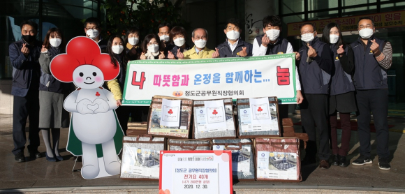 | ↑↑ 청도군공무원직장협의회가 청도군청 전정에서 지역의 어려운 주민들을 위해 마련한 전기요를 이승율 군수(앞줄 가운데)에게 기탁한 후 하트를 그리고 있다. 청도군 제공 |