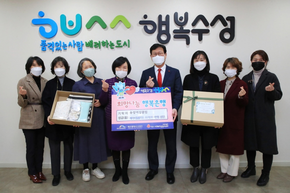 | ↑↑ 수성여성클럽 관계자들이 지난 7일 수성구청을 방문해 돌봄 취약계층 영유아들을 위한 첫만남 꾸러미를 수성구청에 전달한 후 기념촬영하고 있다. |
