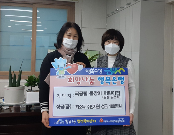| 대구 수성구 황금1동에 위치한 국공립 물망이어린이집은 지난 7일 저소득 취약계층을 위해 써달라며 성금 100만 원을 황금1동행정복지센터에 전달했다. 김은희 원장은 “어려움을 겪고 있는 이웃에게 나눔을 전할 수 있어 기쁘다”고 말했다. 윤기영 기자 |
