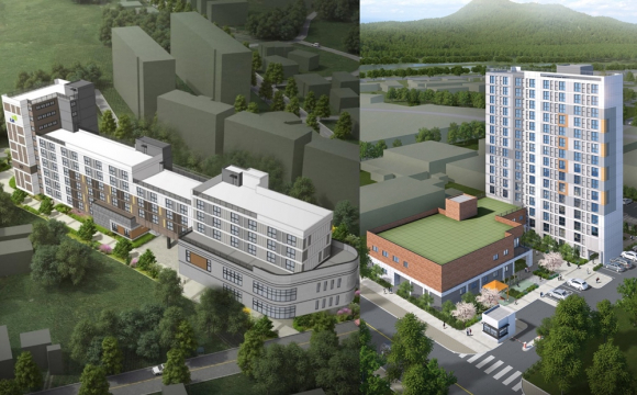 | ↑↑ 사진 좌측부터 안강읍 고령자 복지주택, 황성동 고령자 복지주택 조감도.<경주시 제공> |