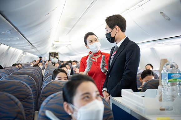 | ↑↑ 대구한의대 항공서비스전공 학생들이 티웨이항공 승무원과 기내서비스 체험을 하고 있다, 대구한의대 제공 |