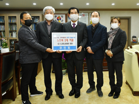 | 우민회(회장 이재기)가 지난 25일 경산 드림스타트 아동을 위해 노트북 5대(500만 원 상당)를 전달했다. 우민회는 2008년 5월 결성된 순수교육봉사단체(회원수 40명)로 교육도시 경산발전을 위해 활동하고 있으며, 지역의 소외된 아동과 청소년을 위해 2013년부터 매년 노트북을 후원하고 있다. 이재기 우민회 회장은 “이번 노트북 지원이 드림스타트 아동 등에게 교육적인 도움이 돼 아동들이 더 큰 미래를 꿈꿀 수 있길 바란다”고 말했다. 이번 후원은 드림스타트 대상 아동 4명과 지역아동센터 이용 아동 1명 등으로 폭넓게 대상자가 선정됐다. 최영조 경산시장은 “매년 잊지 않고 아동들을 위해 후원하는 것에 깊은 감사를 드린다. 시도 아동들의 공평한 교육 환경을 마련해 미래의 리더로 성장할 수 있도록 노력하겠다”고 말했다.