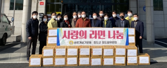 | ↑↑ 청도읍 바르게살기위원회 조희제 위원장과 위원들이 청도읍을 방문해 라면 50박스(시가 150만원 상당)를 이강모 청도읍장에게 기탁한 후 단체 사진촬영을 하고 있다. |