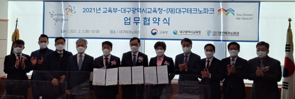 | 대구TP가 2일 교육부(사회부총리 겸 교육부장관 유은혜)와 대구시교육청(교육감 강은희)와 대구벤처센터에서 지역단위 고졸취업 활성화기 위한 업무협약을 체결했다. 이번 협약은, 코로나19로 전반적인 청년고용 및 지역경제의 여건이 어려운 상황에서 고졸청년 인재들이 산업계 맞춤형으로 성장해 능력에 따라 공정하게 취업하고 진로를 개척해 나갈 수 있도록 지원하기 위해 마련됐다. 협약에 이어 대구TP 지원기업 CEO와 대구시 교육청 직업계고 교장단의 간담회가 진행됐으며, 현장에 참석한 대표CEO 및 대표 교장 이외에 많은 CEO 및 교장들은 온라인으로 참여해 적극적인 관심을 보였다. 정종철 교육부 차관은 "오늘 업무협약은 직업교육의 혁신을 이끌고 있는 교육청과 모범적인 기업지원기관이 손을 맞잡는 의미있는 약속으로, 우수협력 모델로 정착해 전국적으로 확산될 수 있기를 바란다"며 이번 업무협약에 대한 기대를 나타냈다. 강은희 대구시교육청 교육감은 "대구 직업교육의 작은 발걸음이 모여 우리나라 직업교육의 작은 디딤돌이 될 수 있도록 대구테크노파크와 함께 긴밀하게 협력하겠다"는 추진 의지를 밝혔다. 권대수 대구테크노파크 원장은 "향후 대구 스타기업에서 125명, 대구 스마트공장 구축기업에서 376명 등 총 500명 정도의 고졸 채용수요가 있을 것으로 조사됐다“며, “특히 고졸청년 인재들을 위한 이 자리가 대구테크노파크 원장으로 부임 후 첫 번째 업무협약으로, 지역기업이 우수한 고졸 기술인재 채용 확대를 통해 청년층 일자리 확대와 기업의 경쟁력을 높일 수 있도록 추가지원을 아끼지 않겠다"고 강조했다.