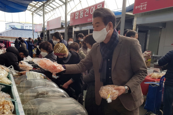 | 청도군의회가 지난 6일 풍각시장, 동곡시장, 지난 9일 청도시장을 방문해 설 명절을 맞이해 전통시장 장보기를 했다. 이날 김수태 의장을 비롯한 청도 군의원, 의회사무과 직원들은 코로나19 확산 방지를 위해 마스크를 착용하고 4인 이하로 구성된 인원으로 장보기에 참여했다. 군의회 의원들은 우리 고장 농산물 및 상품들을 홍보하고 구매하며 전통시장을 이용해 줄 것을 호소했다. 또한 코로나19로 인한 경기침체로 어려움을 겪고 있는 상인들의 애로사항을 직접 청취하고 경제회복에 대한 방안을 논의했다. 김수태 청도 군의장은 “장기화 되고 있는 코로나19의 근절을 위해 방역수칙을 지키면서, 지역경제의 근간이 되는 전통시장이 활력을 되찾을 수 있도록 군민들께서 많은 이용을 해주길 바란다”며 “신축년 새해에는 정겹고, 웃음 가득한 전통시장이 될 수 있도록 군의회도 적극 협조하겠다”고 말했다.