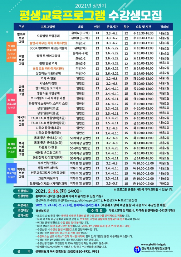 경북도 교육청정보센터가 학생 및 학부모, 지역주민에게 다양한 평생학습의 기회를 제공하기 위해 16일 오후 2시부터 '2021년 상반기 평생교육프로그램 수강생'을 모집한다고 밝혔다. 이번 프로그램은 코로나19 상황에 적극적으로 대응해 보다 안정적인 운영을 위해 대면·비대면 수업방법 및 수강인원을 탄력적으로 적용할 예정이다. 상반기 프로그램은 ▲유아 대상으로 오감발달 토탈공예 등 4개 강좌 ▲초등학생 대상으로 놀면서 배우는 똑똑수학 등 5개 강좌 ▲일반인 대상 시낭송의 참맛, 핸드페인팅 포크아트 등 12개 강좌 ▲어르신 대상 다도와 차 한 잔 등 5개 강좌 ▲학부모 대상으로 생활아트 패브릭, 창의책놀이지도사 자격증 과정 등 5개 강좌, 총 31개의 대상별 맞춤형 프로그램을 운영한다. 손경림 정보센터관장은 "학생 및 학부모, 지역민의 자기계발 욕구를 충족시키고 삶의 질을 높일 수 있도록 다양하고 알찬 평생교육프로그램을 적극 지원하도록 노력하겠다”고 말했다. 개강은 내달 2일이며, 수강신청은 16일 오후 2시부터 도 교육청정보센터 홈페이지(www.gbelib.kr/geic)를 통해 온라인 선착순 접수로 진행된다. 기타 자세한 사항은 전화(053-810-9931~3)로 문의하면 된다.