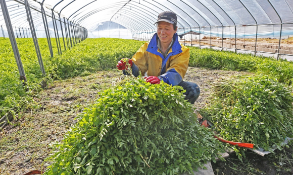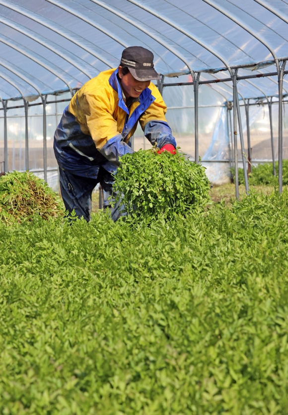 싱싱함의 대명사인 청도 한재 미나리. 16일 오전 청도읍 초현리 한재 미나리 마을의 한 하우스에서 농부 성윤경씨가 올해 첫 수확을 하고 있다. 한재 미나리는 일반 미나리와 달리 품질 유지를 위해 1년에 단 한번만 수확 한다. 황보문옥 기자 |