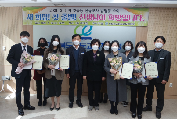 | 청도교육지원청이 지난 19일 교육지원청 2층 제1회의실에서 오는 3월 1일자 청도교육지원청 신규 교사 4명에 대한 임명장 수여 및 오리엔테이션을 실시하고 교직의 첫발을 내딛는 교사들에게 축하의 메시지를 전달했다. 신규 교사들은 선서를 통해 국민에 대한 봉사자로서의 임무를 성실히 수행할 것을 다짐했고 함께 참석한 교육지원청 교육가족들의 축하를 받으며 교직의 첫출발을 하게 됐다. 김금주 교육장은 신규교사들에게 “코로나 상황에서 어렵게 임용시험에 합격한 네명의 교사들이 무척 자랑스럽고 교육공무원선서할 때의 마음을 되새기며 행복한 교직생활을 위해 함께 노력하자”고 당부의 인사를 했다.
