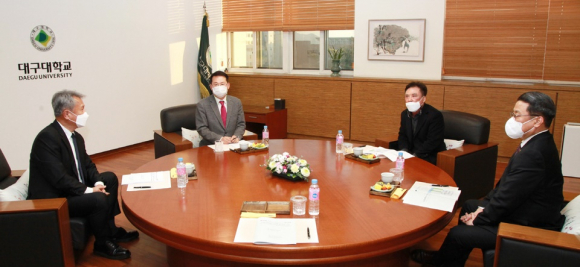 | 국민의힘 윤두현 국회의원(경산)과 경산지역 3개 대학 총장이 지난 19일 대구대(총장 김상호) 경산캠퍼스에서 대학과 지역사회 상생방안 논의를 위한 지역대학 총장 간담회를 개최했다고 밝혔다. 이날 윤두현 국회의원을 비롯해 대구대 김상호 총장, 경일대 정현태 총장, 대구한의대 변창훈 총장이 참석, 지방대학의 위기극복과 지속적인 성장을 위한 지역 상생방안을 모색하며, 대학의 위기가 경산의 위기라는 사실에 공감했다. 또, 지역대학의 주요 현안인 지역인재 유출 심화, 대학 재정 악화, 디지털 신기술 인재양성 혁신공유대학 사업, 지자체-대학 협력기반 지역혁신 사업 등에 대해 논의, 대학별로 정부 및 지자체로부터 재정지원을 받아 진행하는 주요 사업에 대해서도 공유하는 시간을 가졌다. 윤두현 국회의원은 “경산지역 대학들은 앞장서서 AI, ICT 인재를 양성하며 4차산업혁명시대 흐름에 발맞춘 경쟁력을 갖추고 있다”며 “특히 경산을 ‘인공지능 ICT 허브’로 조성해 대학과 산업이 함께 지속성장 가능한 환경을 구축하겠다”고 말했다. 김상호 대구대 총장도 “대구대는 활기찬 농촌프로젝트 시범사업, 청년 예비창업가 육성사업, 창업보육센터 지원사업 등 경산시와 다양한 사업을 진행하고 있다”며 “앞으로도 캠퍼스 혁신파크 사업 등 다양한 정부 지원 프로그램을 통해 대학 캠퍼스를 혁신 플랫폼으로 구축하겠다”고 말했다. 황보문옥 기자 |