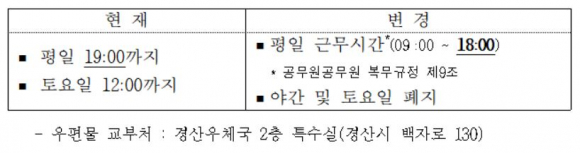 경산우체국(국장 성세형)이 지난 2005년 7월 1일 토요휴무제 시행에도 불구하고 보관우편물 교부업무를 지속 제공해 왔으나 집배원 및 직원들의 업무경감을 위해 내달 1일부터 교부시간을 조정 운영하게 됨에 따라 지역주민에게 널리 알리고 이해를 요청했다.