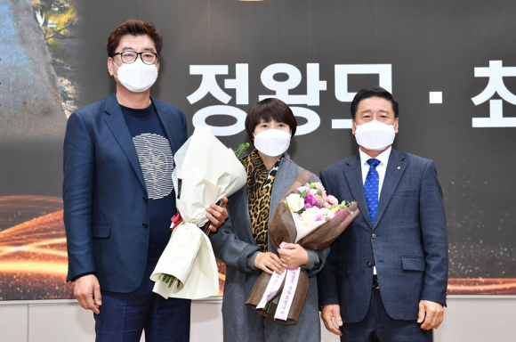 | ↑↑ 좌측부터 정왕모, 최재희부부와 청도축협 김창태 조합장이 새농민상 수상한 후 기념촬영을 하고 있다. 청도축산농협 제공 |
