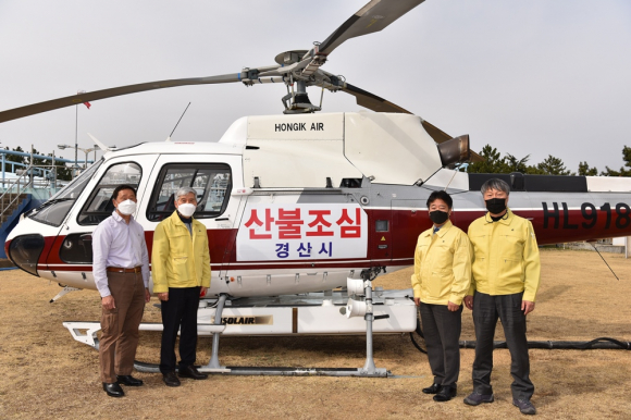 | ↑↑ 이기동 경산시의회 의장(왼쪽 두번째)이 관계공무원과 함께 산불 진화헬기를 이용해 봄철 산불방지 순찰활동에 적극 나서고 있다. 경산시의회 제공 |