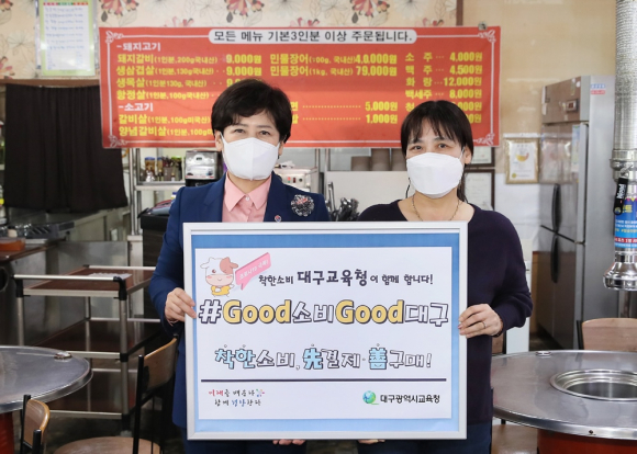 | ↑↑강은희(왼쪽)대구시교육감, ‘착한 소비 운동’에 동참. |